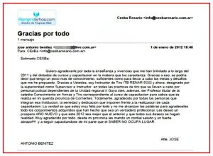 Quiero agradecerle por tada la enseñanza y vivencias que me han brindado a lo largo del 2011 y del dictados de cursos y capacitacion en la materia que los caracteriza. Gracias a eso, se podria decir que tengo un poco mas de conocimiento, suficientes como para llevar a cabo las metas y desafios que me he propuesto. Gracias a Ustedes, soy Instructor de Tiro ITB RENAR 5XXX y ahora, designado por la superioridad como Supervisor e Instructor en todas las precticas de tiro que se lleven a cabo por personal policial dependientes de la Unidad regional II Goya ctes; ademas, ser Profesor titular de la catedra Conocimiento en Armas y Tiro correspondiente al curso de capacitacion para cabos que se realiza en mi querida provincia de Corrientes. Totalmente, agradecido por todas las personas que integran esa Institucion, la seriedad y dedicacion que imponen frente a la realizacion de cada capacitacion. La verdad es que estoy muy feliz por todo y no me alcanzan las palabras para agradeceles todo los conocimientos adquiridos que han hecho que sea un verdadero profecional. Les deseo un prospero AÑO NUEVO y que este 2012 sea mejor que el anterior y que todos sus deseos se hagan realidad. Muy agradecido por todo, desde mi provincia les mando un cordial saludo y un fuerte abrazo!!!! y a seguir capacitandose de mi parte que el SABER NO OCUPA LUGAR.