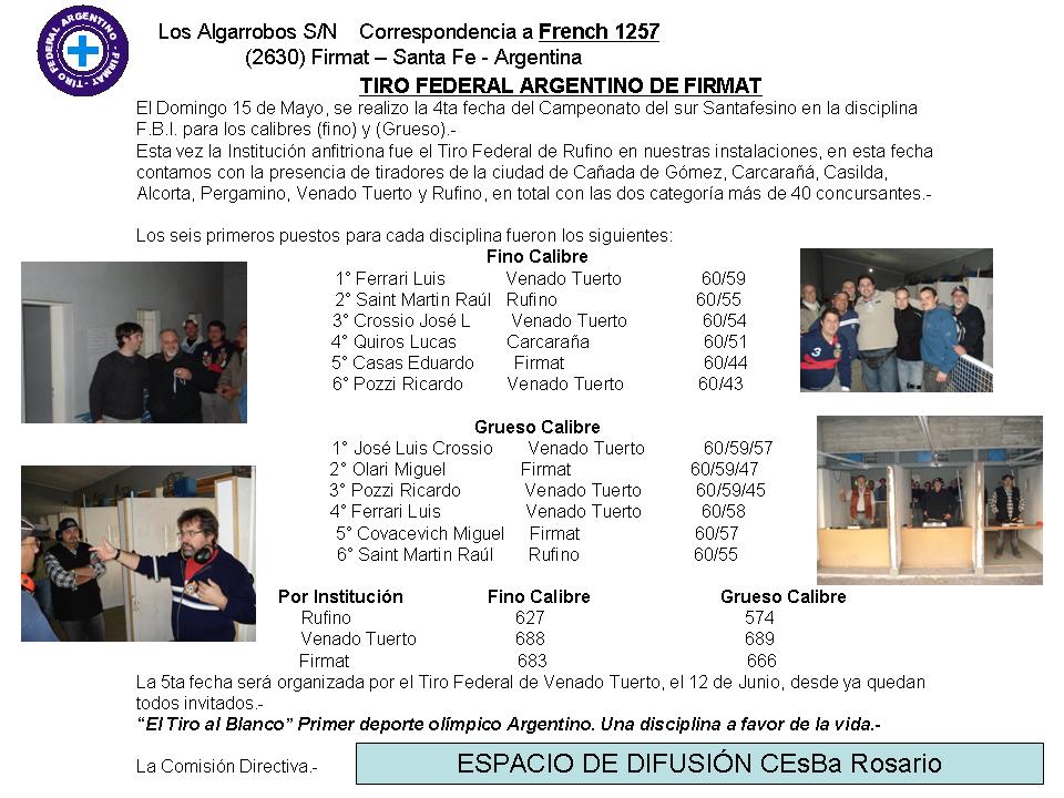 El domingo 15 de Mayo, se realizo la 4ta fecha del Campeonato del sur Santafesino en la disciplina F.B.I. para los calibres (fino) y (Grueso).-